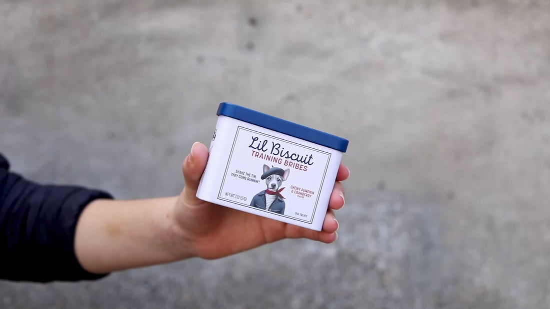 Our novel on-the-go training tin is pocket-sized, usable with one hand, and reinforces Pavlov's conditioning method. Your dog will come running every time they hear it shake. It's a treat tin, a training tool, and it's super cute.